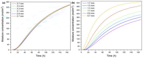 Effects of (a) EMC thickness and (b) PCB thickness on the evolution of maximum moisture concentrations on die surfaces at 85 °C/85% RH.