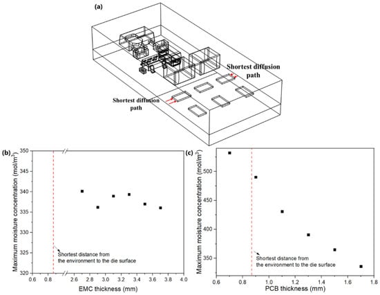 (a) Shortest diffusion path in the original model (case 1) and the effects of (b) EMC thickness and (c) PCB thickness on the maximum moisture concentration on die surfaces.