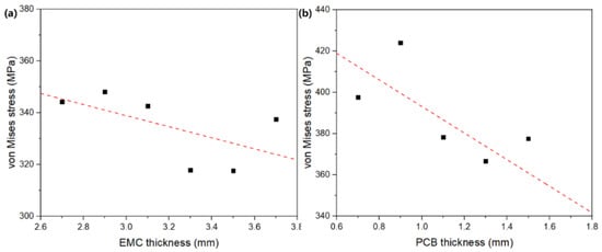 Figure 9 demonstrates the comparison of influences of EMC thickness and PCB thickness on maximum stress within silicon chips under 85 °C/85% RH. This shows that the maximum stress generally decreased linearly with a thicker EMC or PCB. Curve fitting yielded σ = 403.1-21.4d for EMC thickness and σ = 457.6-64.5d for PCB thickness, where σ is the maximum stress in chips (MPa) and d is the thickness (mm). The negative correlation between maximum stress and thicknesses of EMC and PCB can be attributed to smaller amounts of absorbed moisture and less consequent swelling mismatch if the thickness increases. The maximum stress is more sensitive to PCB thickness (Figure 9b) because it is at a comparable level to the shortest existing diffusion path.