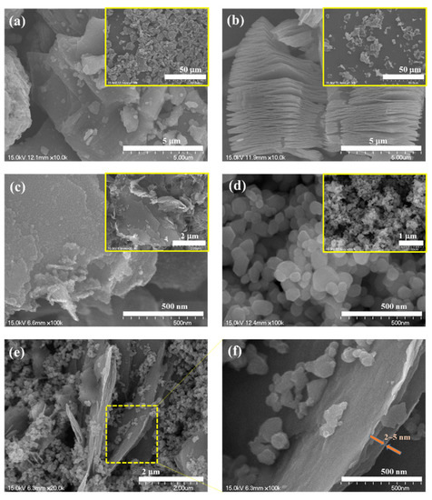 SEM images of (a) Ti3AlC2 MAX phase, (b) Ti3C2Tx MXene multilayer, (c) Ti3C2Tx MXene few-layer, (d) pure ZnO nanoparticles, and (e,f) ZnO/Ti3C2Tx hybrid structure. The insets show low-magnification SEM images.