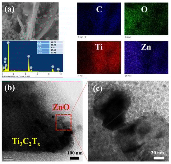 (a) SEM images and EDX spectrum with EDX element maps of Ti, C, O, Zn, and (b,c) HR-TEM images of ZnO/Ti3C2Tx heterostructure.