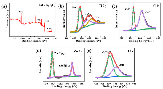 (a) Overall XPS spectrum of ZnO/Ti3C2Tx nanocomposite (ZT2). Focused XPS spectra of (b) Ti 2p, (c) C 1s, (d) Zn 2p, and (e) O 1s, respectively.
