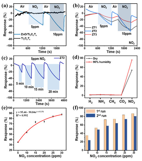 In order to find the performance of the excellent gas-sensitive and selective activity of ZnO/Ti3C2Tx nanocomposite, the gas sensing activities of pure MXene, pure ZnO, and ZnO/Ti3C2Tx with different MXene weight ratios were also recorded and shown in Figure 6. Figure 6a,b illustrates the response of ZT1, ZT2, ZT3, and pure MXene sensors to NO2 concentrations at 5 ppm and 10 ppm, respectively. The response signal of pure ZnO did not detect at room temperature, indicating semiconductor characteristics. The response signals of all the sensors were enhanced with the increase of NO2 concentration, while the response of pure Ti3C2Tx MXene was not well developed with noise signals, due to metallic behavior. The responses to 5 and 10 ppm NO2 were calculated at 35% and 54%, respectively. The NO2 response and recovery properties of ZT2 at room temperature were more substantial than those of ZT1 and ZT3, which were inadequate (Figure 6b).