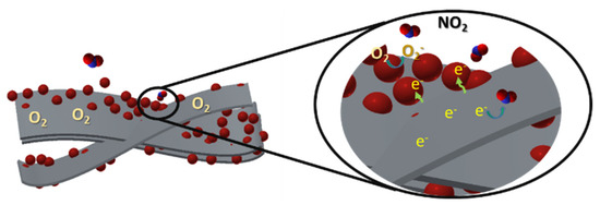 The improved NO2 sensing activity of the nanocomposite was attributable to the creation of a heterogeneous p-n junction. When the ZnO/Ti3C2Tx MXene nanocomposite sensor was exposed to the air, oxygen molecules were covered and captured by the electrons on the material layers, as shown in Figure 7. At room temperature, most adsorbed oxygen molecules tend to create negative oxygen species (O2−, O2−, and O−) at defects and active sites of the sensor layers, which play a predominant part in improved gas sensing [33,34,35].