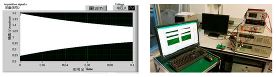 Q value measurement is based on the oscillating principle [17]. Labview software, an NI PXI 4461 acquisition card, an analog circuit, and a MEMS sensor are included in the test system. A part of the test process is as follows: by applying excitation signals to the resonant structure of the MEMS sensor using the acquisition card, Labview software causes the sensor to enter the steady state. After stopping the excitation, the sensor is in a state of damped vibration. As a final step, the acquisition card collects the transient response voltage signal and passes it to Labview for analysis and processing. Using Labview software, it is possible to determine the resonant frequency and Q value rapidly by using wave peak detection technology, the cycle average method, and exponential fitting algorithm.
