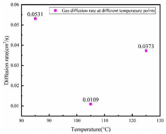 In a sealed cavity, the rate of gas release is determined by parameter c, and the rate of gas release is related to the temperature inside the sealed cavity. According to theory, the higher the temperature, the greater the rate of outgassing. Figure 6 illustrates the results of the tests conducted in this paper. The outgassing rate at 85 °C is the highest, which is 0.0531; the outgassing rate at 105 °C is the lowest, which is 0.0109; and the outgassing rate at 125 °C is in the middle, which is 0.0373.