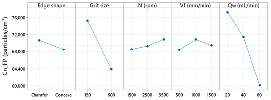 We can see from this figure that the grit size and the flow rate are the most significant factors, in that increasing them reduces the total number concentration of FPs. The use of rough tool (Grit 150) produces more fine particles compared to the use of a finishing tool (Grit 600 for example). In finishing operations, more ultrafine particles are expected than fine particles. In the roughing phase where brittle fracture is the material removal mechanism, the tool attacks a hard surface with many ridges and aims to remove as much material as possible to shape the edge of the workpiece; this results in a high concentration of particles. As for the finishing phase, where the material removal mechanism is fluid flow characterized by an increase in tool/part contact pressure and a decrease in the friction coefficient, as pointed out by Saidi et al. [18], the tool does not remove a large amount of material, which explains the low concentration of FPs, since the tool just applies a rubbing force on the edge which gives a low roughness and a good gloss to the polished surface. Increasing the MQL lubrication flow results in minimal FP emissions. Regarding the edge shape, it was found that the emission of FPs was higher using the chamfer tool compared with the concave shaped tool. This result was explained by the fact that the chamfer tool removes a larger volume of material according to Table 3. According to Figure 2, the high cutting speeds and feed rates favored the generation of more FPs during edge-finishing.