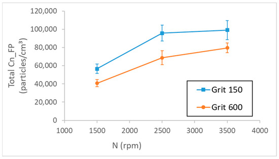 Total number concentration of FPs as a function of spindle speed while roughing and finishing a concave edge of white granite (= 1000 mm/min, = 20 mL/min).