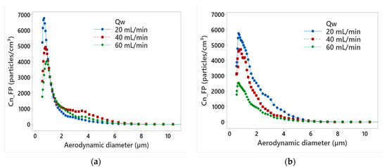 Figure 4 illustrates the number concentration of FPs as a function of aerodynamic diameter of the particles for different values of MQL flow rate during the roughing phase using chamfer and concave tools. The chamfer tool generated more FPs than the concave-shaped tool at all lubrication flow rates as already demonstrated in Figure 2. It was also found that increasing the MQL flow rate decreased FP emissions. By using 60 mL/min flow rate, the peak number concentration of FPs is reduced by 45% and 56%, compared to the 20 mL/min MQL flow rate, using chamfer and concave-shaped tools, respectively. These maximum concentrations were observed at aerodynamic diameters below 2 μm, which pose a threat to workers’ safety.