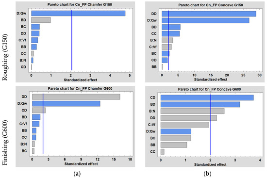 Pareto charts for Cn_FP emitted while edge finishing the white granite workpiece using 150 and 600 grit sizes of: (a) chamfer shape tool, (b) concave shape tool.