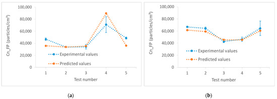 Figure 6 presents the graph of FP number concentrations that were obtained during the validation tests, versus the graph of the values corresponding to the same parameters in the different models developed. We can see that these models are effective and the experimental values approach the predicted values. These models had good correlation coefficients exceeding 80% with relatively small errors (between 10 and 30% for Concave G150, and less than 10% for Chamfer G600). Model errors were calculated as shown in equations 5 and 6, with , considering that is the model prediction, is the experimental measurement and was chosen as the maximum value: