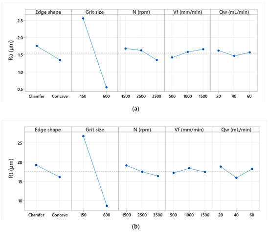 The same approach used to analyze the particle concentrations was employed to study the surface finish. In Figure 7, main effects plots of arithmetic roughness Ra and Rt are shown, giving a general overview of the behavior of studied responses towards the variations in experimental design parameters such as edge shape, grit size, spindle speed, feed rate and lubrication rate. The plots were generated using Minitab software. The details of the use of the software are elaborated upon in the Discussion section.