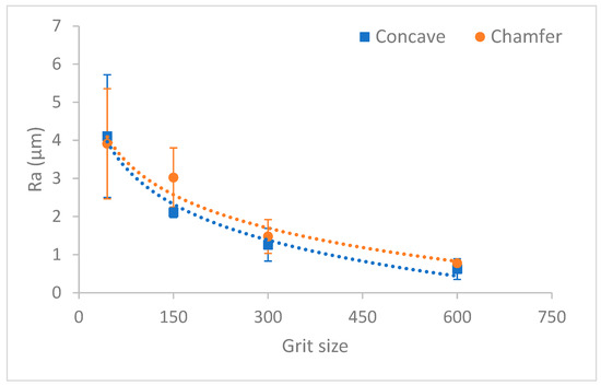 Roughness Ra depending on grit size for chamfered and concave shape tools.