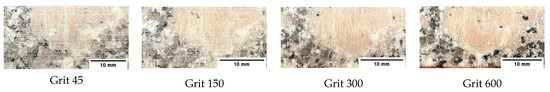 The effect of grit size is observed through the evaluation of the surface profiles of edges made with different tools (chamfer and concave). The polishing conditions were set at = 2500 rpm, = 1000 mm/min and = 60 mL/min. Comparisons between the edge surface roughness in the two cases were carried out using the arithmetic mean deviation Ra in addition to the observation of surface profiles as shown in Table 8. It can be noted that there are several dips and peaks in the surface profiles defined by high negative and positive amplitudes as well as non-periodic amplitudes while scanning the surface of the edge. This is due to the heterogeneity of the granite material, which is composed of several crystals stuck together. Therefore, the choice of the comparison criteria for the surface roughness was made for an arithmetic mean given by the mean deviation Ra. On a same scale, the amplitudes tend to decrease significantly from one grit size to the next with both chamfered and concave shaped tools. This explains the effect of an increased amount of diamond present in tools with larger grit sizes, which can minimize the irregularities and ridges present in the material and improve its surface quality. Figure 10 shows an example of polished surface with the different grit sizes of concave edge shape at = 2500 rpm, = 1000 mm/min and = 60 mL/min.