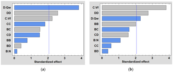 ANOVA analysis is carried out at a 5% significance level (p-value below 0.05) and a 95% confidence level. Pareto charts for the different tools/grit sizes used are illustrated in Figure 5 showing the influence of parameters , and selected in the DOE. They compare, in descending order, the statistical significance of the main factors and their interactions. We can see in all graphs that the lubrication flow is the most significant parameter either in linear or quadratic form, or in interaction with another factor.