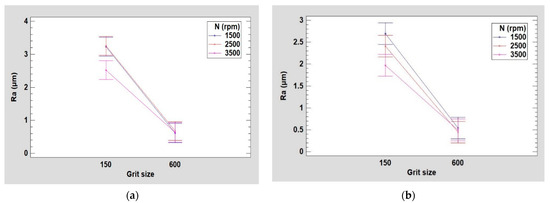 The study of edge surface roughness which aims to find out the parameters that influence the response parameter Ra during the edge finishing of white granite revealed that the greatest importance on the surface finish during the whole process is the grit size of the tool used. It is obvious that the increase in grit size during the polishing process will result in a better surface finish, which is why this study covered the roughing and the finishing phases. Varying the spindle speed did not contribute towards obtaining a better surface finish in the finishing phase (grit 600). In the roughing phase (grit 150), however, its increase led to a decrease in Ra (Figure 14). This result confirms the work of Bahri et al. [17], which gave due importance to the effect of spindle speed on the generation of particles during the roughing phase, since in the end, the roughness desired by the customer will be attained progressively when reaching the finishing stage.