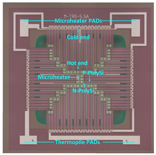 The key structural parameters of the thermopile are shown in Table 1. The microscopic image of the device is displayed in Figure 3. By applying an input voltage for the microheater to generate joule heat, the heat transfers to the hot ends of the thermocouple strips through solid heat conduction. Subsequently, a temperature difference between the hot and the cold ends is generated, then, an output voltage is generated in the sensor, which can be detected from the electrodes of the thermopile. According to Equation (2), the output response voltage and the response time of the thermopile can be obtained.