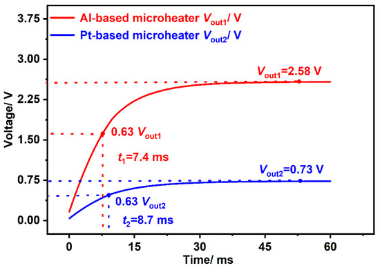 Figure 5. Simulated output voltages and response times of the same device embedded with an Al—based microheater and a Pt—based microheater.