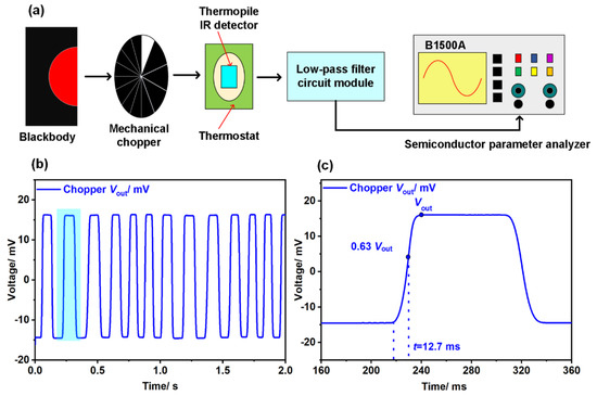As shown in Figure 6a, a chopper—based system for measuring response time consists of a blackbody radiation source, a mechanical chopper, a thermostat, and a semiconductor parameter analyzer, etc. During the measurement, the device was placed in a thermostat, which was used to keep the detector at an ambient temperature of 23 °C consistently. The temperature of the blackbody was set at 500 K. With the function of the chopper, the infrared radiation was modulated into a 5 Hz alternating signal before reaching the device in the thermostat. Subsequently, an alternating voltage signal with the same frequency was exported by the detector and displayed on the semiconductor parameter analyzer after passing through a low—pass filter circuit module. As illustrated in Figure 6b,c, the response time obtained by the chopper—based system was 12.7 ms.