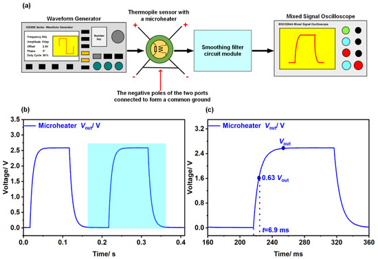 Figure 7a illustrates an in situ microheater—based system, which consists of a signal generator, a thermopile sensor embedded with a microheater, a smoothing filter circuit module, and an oscilloscope. In the measurement, a square wave voltage of 5 V @ 5 Hz generated by the signal generator was applied to the microheater, then the output voltage of the thermopile was captured by the oscilloscope after being filtered by a smoothing filter circuit module. As depicted in Figure 7 b,c, the response time based on the microheater system was 6.9 ms.