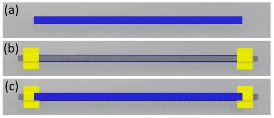 FFF was used to fabricate samples, of which the target dimensions were 10 mm wide, 200 mm long, and 1 mm thick. In the middle of the samples, an 8-mm-wide and 230-mm-long piece of CFC was placed longitudinally. CFCs were cut in the machine direction orientation (MDO), their loose ends serving as electrical contacts. Then, the CFC was fixed with two strips of Kapton tape to avoid using an adhesive and to reinforce the electrical contacts. The placed CFCs affected the samples’ dimensions, measured with a digital Vernier caliper with ± 0.01 mm measurement resolution. The sample preparation steps, drawn in Solidworks 3D design software (version 2021, Dassault Systèmes SolidWorks Corporation, Waltham, MA, USA), are presented in Figure 1.