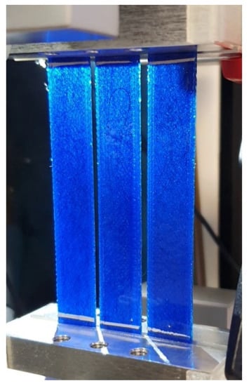 In the cyclic tests, three samples from the same category were fixed together in the 50-mm-wide clamps and simultaneously stretched 10,000 times. During testing, the tensile tester measured the average force and displacement of three samples, and the resistance measurement system measured each sample’s resistance. For every sample series in Table 1, five degrees of tensile deformations were tested (10%, 20%, 30%, 40%, and 50%), and 25 cyclic tests were conducted. Figure 2 presents the clamped cyclic test samples with background light. After the cyclic tests, a strain sensor test was carried out with the cyclic test setup and a previously tested (50% elongated) cyclic test sample with a 153 µm nominally thick carbon fiber layer. The sample was elongated repeatedly up to 10% with a speed of 0.5 mm/min.