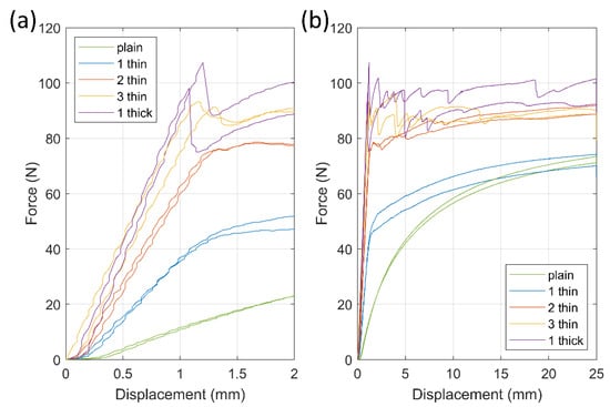 Force–displacement curves of the 3D-printed samples. (a) Results focusing on the initial 2 mm displacement (4% elongation), presenting the increase in stiffness caused by CFCs, (b) the samples’ total displacement was 25 mm (50% elongation).