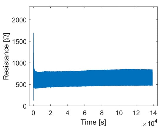 As shown in Figure 9b, the practical dynamic range of the sensor was 750 Ω–1800 Ω. The system shown in Figure 9b was not strictly linear. The nonlinearity error and noise were <5% of the full scale. The sensor’s output after the structure stabilized was repeatable, and the nonlinearity could be compensated for using software.