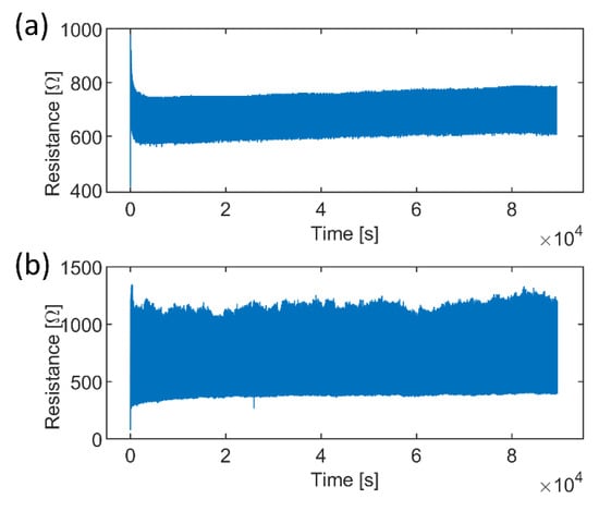 Like Figure 7, Figure 8 shows the changes in the average resistance in the samples per 5000 cycles, which indicates how much the resistance changed in the stable cyclic deformation phase of the cyclic samples (previously defined as phase 3). The failed samples that reached the 3000 Ω failure limit in Figure 7 are absent from Figure 8.