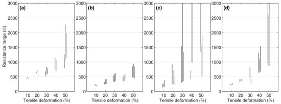 Figure 7 shows the resistance ranges of the cyclic sample series, with the electromechanical behavior of each measured sample regarding its resistance properties is displayed as a vertical line. The results of the three parallel samples are grouped, and the endpoints of the lines show the maximum and minimum resistances, whereas the line’s length displays the resistance change during stable cyclic loading. As depicted in Figure 7a, the sample series with one thin CFC showed a moderate, gradual increase in its resistance range before the final 50% deformation level, which increased the samples’ resistance range and variation. Figure 7b shows the modest resistance behavior of the series with two thin CFCs, with similar resistance values at the 30% and 40% deformation levels; at the 50% deformation level, the resistance range was less than 500 Ω.