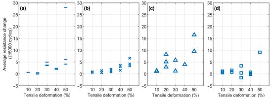 In Figure 8a, the series with 1 thin CFC exhibited a change of approximately 5 Ω (1%) or smaller throughout 5000 cycles, except for a 50% tensile deformation level. The more random 50% tensile deformation level indicates the possible electrical limits of the sample series. In Figure 8b, the change in resistance increased as the tensile deformation increased; in the 10–30% tensile deformations, the average resistance change was always lower than 3 Ω (0.5%). At the 40–50% level, the resistance change was still small, but the low resistance range in Figure 7b increased the percentual resistance change and the results were approximately 5 Ω (lower than 1%).