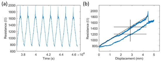 Figure 9b also shows hysteresis and sensitivity. The maximum difference during the hysteresis cycle was 220 Ω, which corresponds to ~10% of the full scale. The sensitivity of the sensor structure was ~200 Ω/mm.