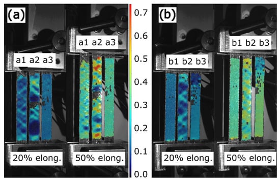 The 3D-printed samples are also studied with DIC to identify local deformations to supplement the mechanical test results. The results of DIC analyses for the different sample series are presented in Figure 10.