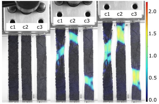 DIC y-axial Hencky strain analyses of the elongation of laminated CFC samples, where the c1 sample had 1 thin CFC, the c2 sample had 2 thin CFCs, and the c3 sample had 3 thin CFCs between the transparent TPU films. The deformation was mostly localized in the failure locations, whereas the rest of the sample exhibited almost no deformation under the load. The scale bar shows the level of local deformations compared to the initial undeformed phase of the samples.