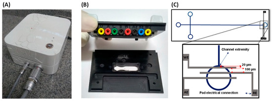 Portable instrumentation for ME–AD analysis including: (A) HVStat system manufactured by MicruX Technologies (Asturias, Spain) with integrated bipotentiostat coupled with a high voltage power source, (B) microfluidic holder (model MCE-HOLDER-DC02), (C) layout of the hybrid microchip composed of SU-8/glass with integrated electrodes for electrochemical detection highlighting the positioning of electrodes at end-channel arrangement.