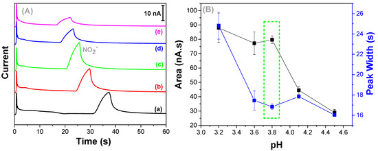 According to the literature, the separation of the anionic species by ME devices is successfully performed when lactic acid is used on the running buffer [50,51]. Therefore, a buffer solution composed of lactic acid and histidine was prepared at different ratios to investigate the pH effect on nitrite determination. Th analyses were carried out in an acidic medium to favor nitrite oxidation [65,66,67,68]. For this purpose, the lactic acid concentration was fixed at 30 mmol L−1 and the histidine concentration ranged from 5 to 25 mmol L−1 (5 mmol L−1 increments), providing solutions with pH at 3.2, 3.6, 3.8, 4.1, and 4.5, respectively (a–e) (Figure 2A). An increase in the concentration of histidine led to an increase in the pH of the electrolyte and an improvement in peak shape. However, at 20 mmol L−1 of histidine, the peak area decreased, and the peak width had widened (Figure 2B), which negatively impacted the sensitivity and separation efficiency. Thus, the run buffer that was composed of 30 mmol L−1 lactic acid and 15 mmol L−1 histidine (pH = 3.8) was defined as optimum and kept constant once it also provided the lower relative standard deviation values.