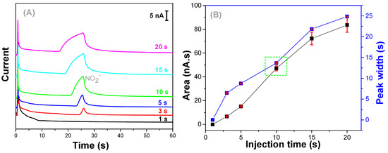 The sample was electrokinetically introduced into microchannels using the floating mode. To achieve the suitable injection time, a 50 µmol L−1 nitrite standard solution was used as model. For this purpose, injection time was varied from 1 to 20 s. As shown in Figure 3A, the presence of nitrite was observed only for injection times longer than 3 s. As expected, the increase in the injection time caused a greater volume of the sample to be injected and, consequently, a higher signal was observed [63]. For injection times longer than 10s, a noticeable peak broadening with a consequent loss of peak symmetry was observed. Based on the data presented in Figure 3B, the injection time of 10 s was then selected as ideal for the subsequent experiments.