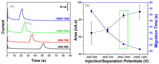 (A) Electropherograms showing the separation and detection of nitrite (50 µmol L−1) under different injection/separation voltages. (B) Peak area and migration time versus injection/separation potentials. Experimental conditions are given in Figure 3.