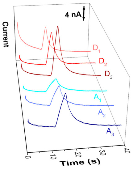 Environmental samples of aquarium water (A) and fish breeding dam water (D) were analyzed and the recorded electropherograms are displayed in Figure 5. Samples were diluted 50% (v/v) and then spiked with nitrite standard solution. Thus, samples labelled as A1, A2, and A3 correspond to the signal obtained for the analysis of aquarium water diluted at 50% (v/v) and fortified with 30, 40, and 60 μmol L−1 of NO2−, respectively. On the other hand, samples labelled as D1 refer to a sample of dam water diluted by 50% (v/v), while samples D2 and D3 are the same dam water diluted but fortified with 20 and 40 μmol L−1 of NO2−, respectively. All six samples (A1, A2, A3, D1, D2, and D3) were analyzed in triplicate by both the proposed and the reference methods. The aquarium samples (A) showed a lower concentration of nitrite due to the nitrogen cycle, presenting concentrations below the detection limit for both the proposed method and the reference method. Freitas and collaborators also found this nitrite profile in aquarium water samples in the first weeks (0 to 8) of operation; however, due to the formation and development of the ecosystem of a small aquarium, the conversion of species to nitrite is not very significant, and the aquarium where the samples were collected had recently been cleaned and reassembled [50].