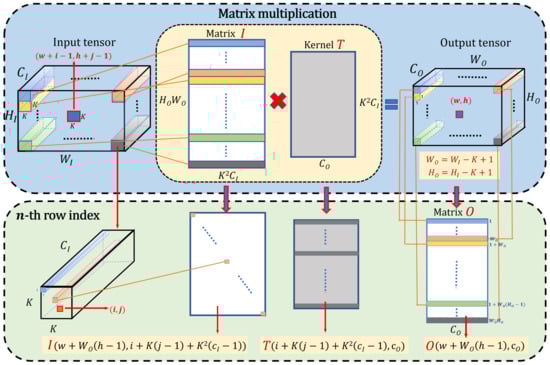 Garipov et al. [] point out that using the TT-decomposition to factorize the convolutional kernel into the product of several low-rank matrices directly has the limitation on the convolutional layer. To address this drawback, a new decomposition is introduced that can be applied to the convolutional and fully connected layers. For a convolutional layer, assume that the input tensor has the size , the output tensor , and the kernel tensor is a 4-dimensional tensor with the size . Now, we can easily write the formula for the operation of a YOLOV5 convolutional layer as: . Figure 1 shows the Tensor Train process and the element shift process. The convolutional formula can also be calculated as several matrix multiplications . The top in Figure 1 shows how the input tensor is decomposed into several matrix multiplications. The purpose of the following derivation is to express the relationship between the input tensor, output tensor, and the kernel tensor via introducing how the n-th row of the input matrix is used to compute the n-th row of the output of the matrix multiplication. First, we transfer the input tensor and the output tensor to matrices. To analyze the process, we define a patch of the input tensor within size and a patch of the output tensor is , so we easily obtain the connection and . Now, we remodel the output tensor into a matrix : , where represents the position of the patch in the plane of the output tensor that is transferred to the height of the output matrix . Furthermore, is the width of matrix , where and . In this way, the 3-dimensional tensor can be reshaped into a 2-dimensional matrix. Therefore, the input tensor also can be resized as follows: