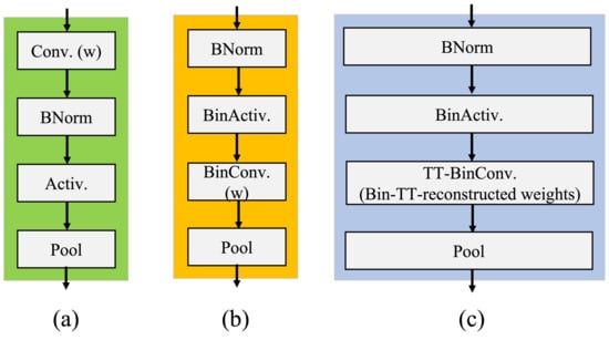 (a) Conventional CNN blocks, (b) XNOR-network blocks, (c) ABFLMC blocks.