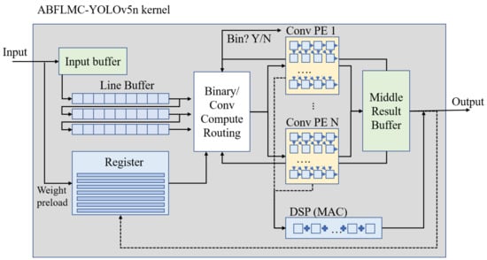 Figure 3 shows our proposed implementation of the FPGA architecture for ABFLMC-YOLOV5. The architecture consists of a computation kernel, registers, and BRAM. Our model presents a higher compression rate resulting in a relatively friendly environment for hardware implementation. Our core weight model size has only 1.39 MB in VOC dataset, which is one-fifth of the size compared to YOLOv5s. This allows fast-speed access from BRAM to become applicable. The PE (processing element) cluster is designed to address a large amount of parallel multiplication and accumulation within the convolution computation. A series of DSPs is implemented as a multiplied cumulative (MAC) system that performs the computation. Attributed to the ABFLMC-YOLOV5 algorithm, the parameters of our model were reduced to a certain level, which benefited from the scarcity of resources that is intrinsic for most low-power computing units. In Figure 3, the routing component computed by convolution is the core of the whole inference computation, which is responsible for running the overall algorithm. Schedule the timing and order of each computation and sends a control signal to access the required data. With our compressed model, the computation complexity for each layer presents an advantage when applied to a pipelining platform with sufficient hardware resources.