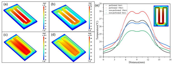 Comparison of the heat transfer properties between the non-perforated sensor and perforated sensor. (a) The temperature distribution of the perforated sensor at a respiratory airflow speed of 10 m/s and (b) at a speed of 6 m/s. (c) The temperature distribution of the non-perforated sensor at a speed of 10 m/s and (d) at a speed of 6 m/s. (e) The temperature distributions from point A to B for non-perforated and perforated sensors at different respiratory airflow rates.