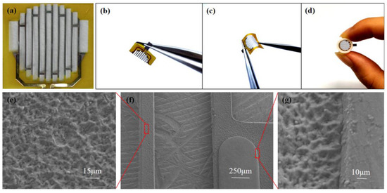 The original impedance of the fPRS is about 14 kΩ, and there is good consistency between different sensors. Through observation under a microscope, as shown in Figure 4a, the appearance is complete and uniform, and the edges are straight and neat. The sputtered Pt film has no cracks, and the width and thickness are uniform, as shown in Figure 4e–f. The connection between the copper wire and platinum is firm, as shown in Figure 4g.
