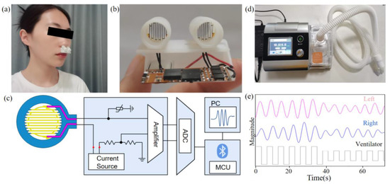 We designed a circuit acquisition module with a Bluetooth function, thereby improving the comfort of breathing monitoring. The way of wearing the respiratory sensor is shown in Figure 6a, greatly reducing the discomfort of the subjects. The sensors can be connected to external circuit modules by flexible wires, as shown in Figure 6b. A lithium battery is also encapsulated by the case. The geometric dimensions of the shell are 38 cm in length, 10 cm in width, and 15 cm in height, respectively, and the inclination angle is 40 degrees. The device does not penetrate the nostrils, and it can be reused after alcohol sterilization.