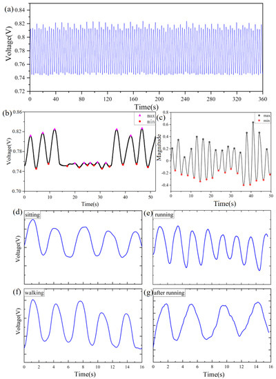 (a) Long−time measurement results (6 min). (b) Apnea respiration signal. (c) Hypopnea. The voltage changes of the sensor during different exercising. (d) Sitting. (e) Walking. (f) Running. (g) After running.