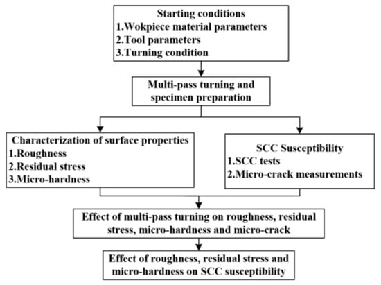 The flow chart of the experimental procedures and results analysis is shown in Figure 1. The starting conditions included workpiece material parameters, tool parameters, and turning condition. Firstly, multi-pass turning operations were performed on AISI 304 stainless steel. Then, physical performance measurements, SCC tests, and crack density measurements were carried out. Subsequently, the effects of multi-pass turning on roughness, residual stress, hardness, and crack density were analyzed. Finally, the influences of roughness, residual stress, and microhardness on the SCC susceptibility were investigated.