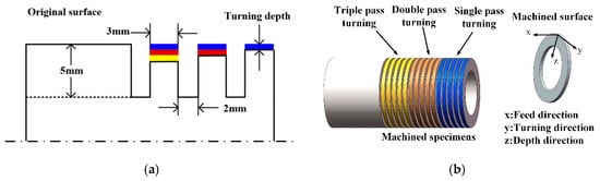 Turning operations were carried out on HTC2050 CNC (SMTCL, Shenyang, China). Grooves were machined on AISI 304 steel pipe with a 3 mm interval, with a turning speed of 600 m/min and a feed rate of 0.05 mm/r. The width and depth of the grooves were 2 mm and 5 mm respectively. Tool_1 (Sandvik, MGMN200 UE050, Sweden) was used to cut the grooves for separating and identifying the multi-pass turning areas. Tool_2 (Sandvik, TNMG160408-MM, Sweden) was used to turn the workpiece surface. The schematic diagram of the multi-pass turning surface is shown in Figure 2a. The workpiece after multi-pass turning and defined directions is presented in Figure 2b. The feed direction and turning direction are considered as axial direction and radial direction, respectively.
