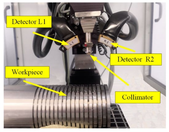 The residual stresses on machined surfaces were measured by an X-ray stress diffractometer (Proto, iXRD, Windsor, ON, Canada), as illustrated in Figure 3. The parameters used in residual stress measurements are shown in Table 3. Mn-Kα was used as the X-ray radiation, the collimation type was a round collimation tube of 2 mm diameter, and the Bragg angle was 156.4°. The voltage and current applied for the measurements were 20 kV and 4 mA, respectively. Ψ angles were applied at 25°, 13.6°, 7.5°, 0°, −7.5°, −13.6°, and −25°, and the austenite diffraction peak was set to be {3 1 1}. For each specimen, the residual stress measurements were performed on the machined surface in the feed direction (axial direction) and turning direction (radial direction). The average residual stress value and standard deviation for each specimen were obtained from three residual stress measurements.