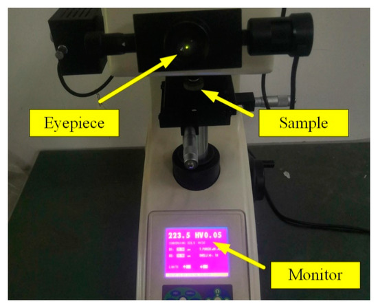 The micro-hardness experiments were conducted on a Vickers hardness tester (Qness, Q10A+, Golling an der Salzach, Austrian) as presented in Figure 4. The workpiece after multi-pass turning was divided into small samples by wire cutting. The surface hardness was measured directly on the small samples. The small sample was inlayed in resin and the cross section was smoothed with 1000 grit sandpaper before the cross-section hardness measurement. A testing force of 100 gf with a holding time of 10 s. Firstly, the micro-hardness of the machined surface was measured. Then, the micro-hardness tests were taken in the cross-section. The range of micro-hardness measurements in the subsurface was about 9 μm~200 μm below the machined surface. Since the indentation area occupied several micrometers, a micro-hardness within first 9 μm below the surface could not be tested. It should be emphasized that the distance between any two micro-hardness test points was at least five times the diagonal length of the Vickers indentation, which avoided any mutual influence among the tested points. During microhardness measurements, errors may be introduced by the experimental apparatus and data estimation. Three surface micro-hardness measurements values were averaged for surface micro-hardness, and the standard deviation was based on the three surface micro-hardness measurements. About 10 sets of microhardness data were measured for each specimen in cross sections within 9 μm~200 μm.